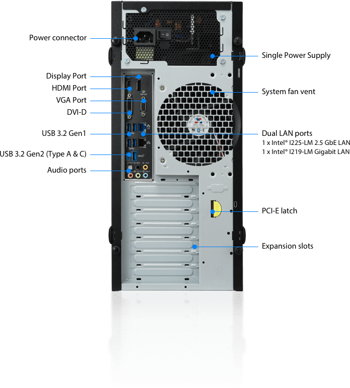 ASUS Pro E500 G6 delivers boosted connectivity with dual onboard Ethernet ports. One of the ports provides Intel 2.5Gb Ethernet, which delivers up to a 2.5X bandwidth improvement for a significant speed upgrade over traditional LAN connections.