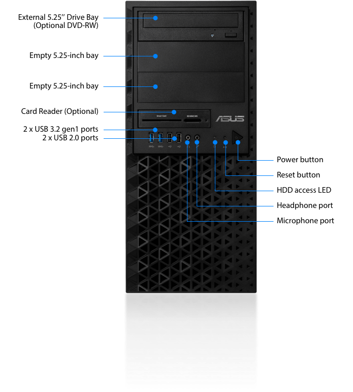 The chassis features an attractive triangular-mesh front panel that also facilitates airflow through the system for improved thermal control to ensure reliability and sustained performance.